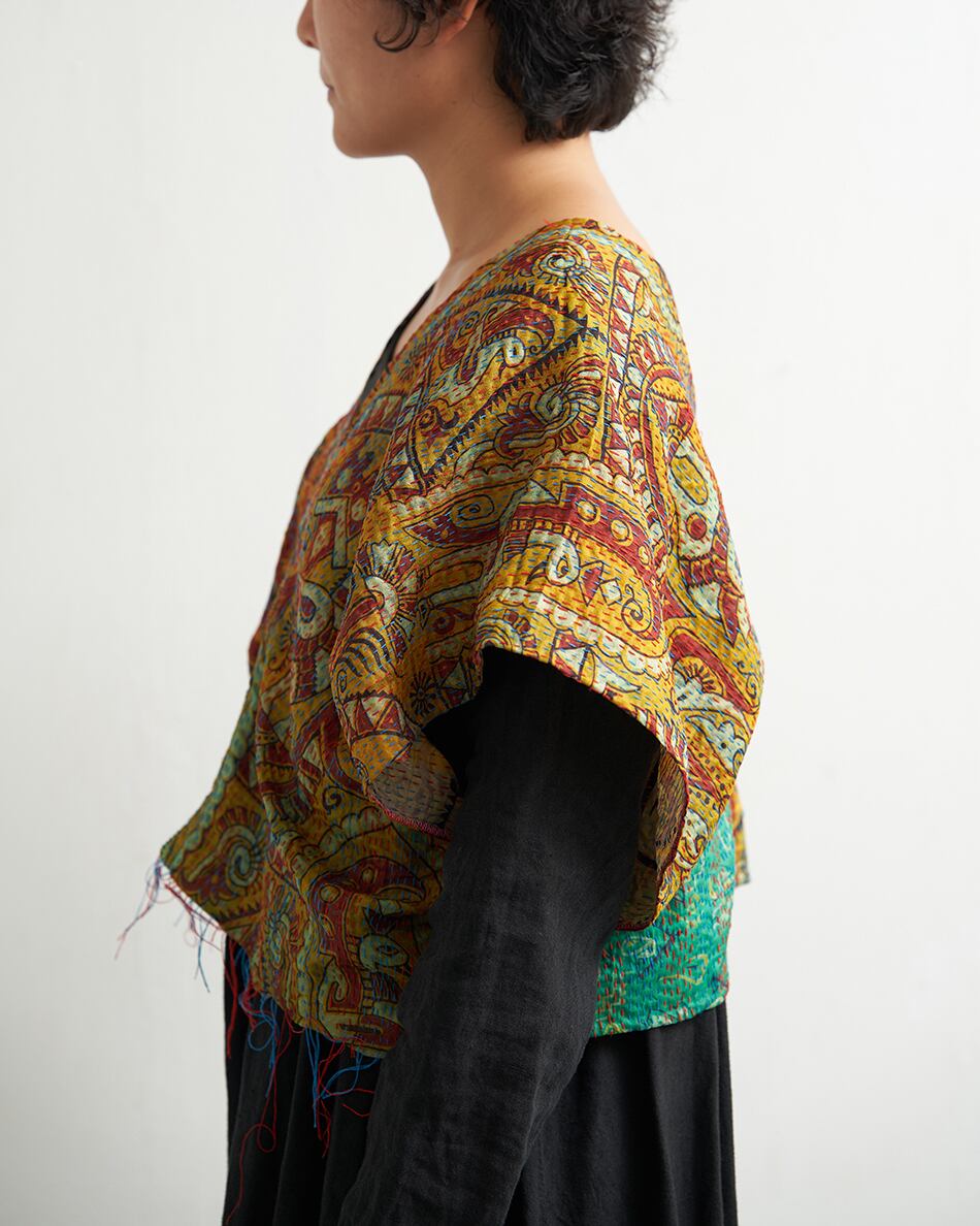 インド・ベンガル地方に伝わる伝統刺繍「ラリーキルト(カンタ布)」。サンスクリット語で“つぎはぎされた布”を意味し、母から娘へと受け継がれてきた手仕事です。かつてサリーや腰巻として使われていた薄手のシルクを二枚重ね、端から端まで丁寧に刺し子を施した布を、トップスに仕立てました。ダブルシルクならではのしなやかさと程よい厚み、光の加減で浮かぶ上品な艶が魅力です。表と裏でまったく異なる布を重ねているため、リバーシブルで着用いただけます。ひと針ごとに感じられる手仕事のぬくもりを、日常の装いに溶け込む一着としてお楽しみください。