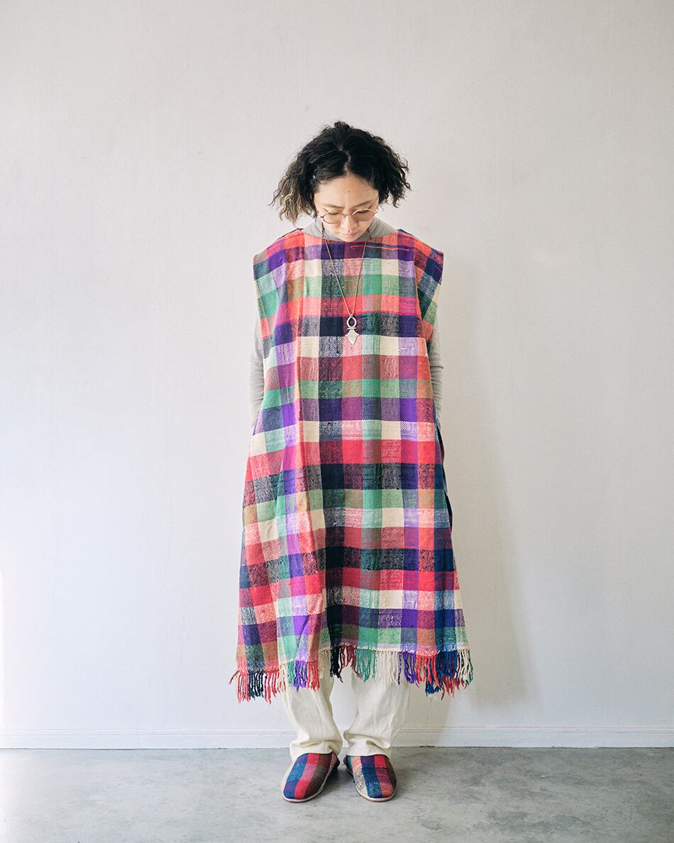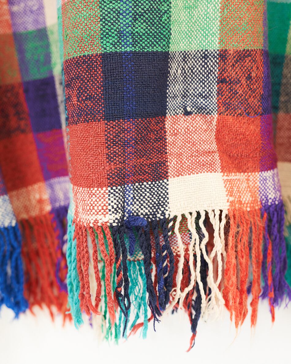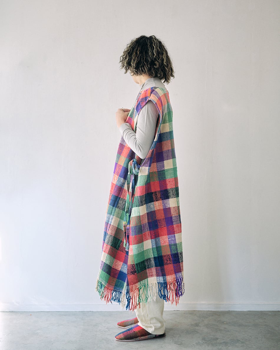 さまざまな色のウールやコットンで織るチェックやストライプはランダムに糸の色を変え、1枚1枚異なり、世界で1枚だけの色合わせとなります。