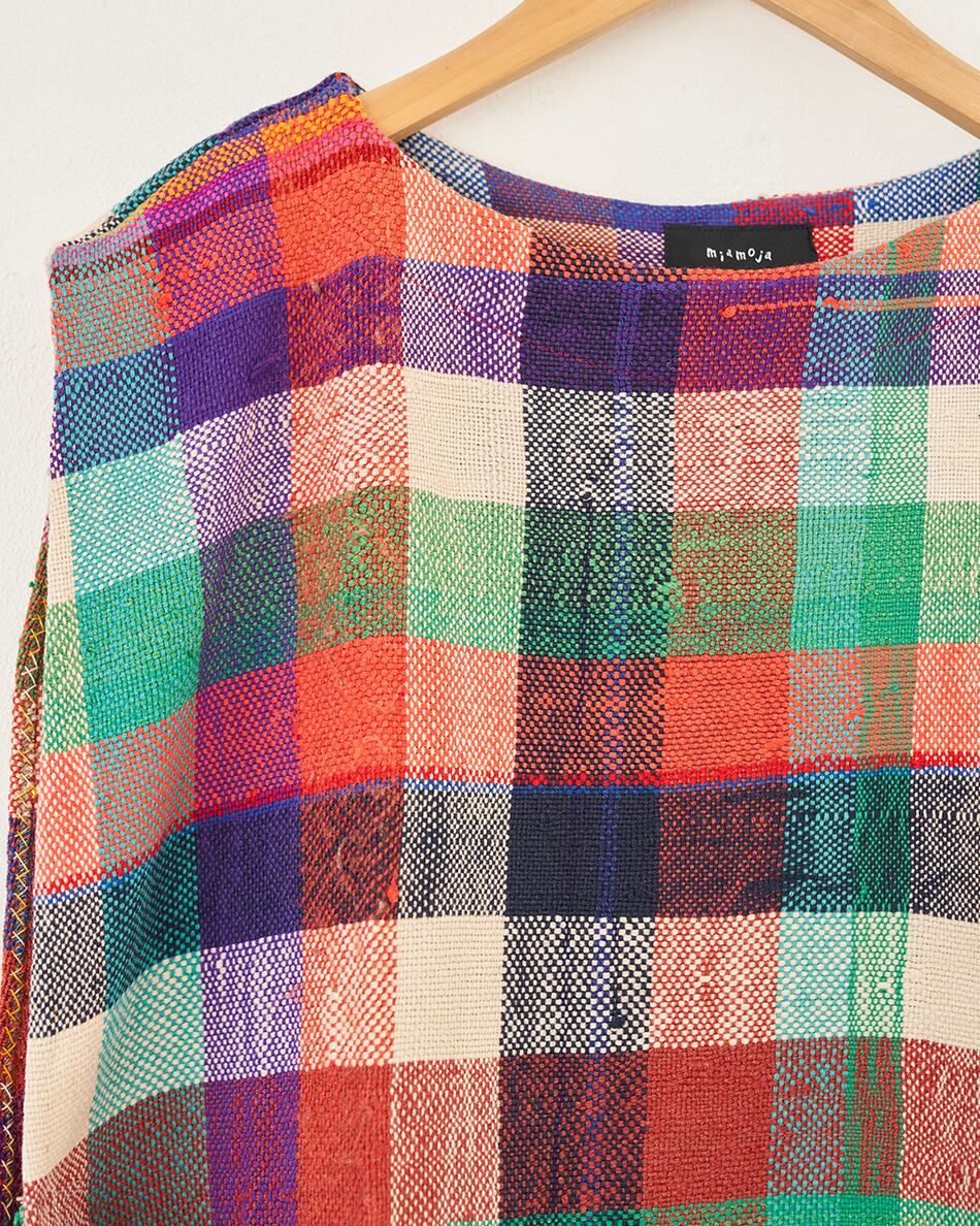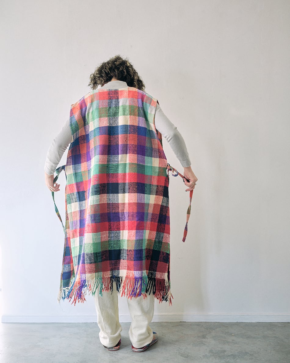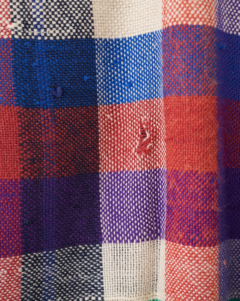 さまざまな色のウールやコットンで織るチェックやストライプはランダムに糸の色を変え、1枚1枚異なり、世界で1枚だけの色合わせとなります。