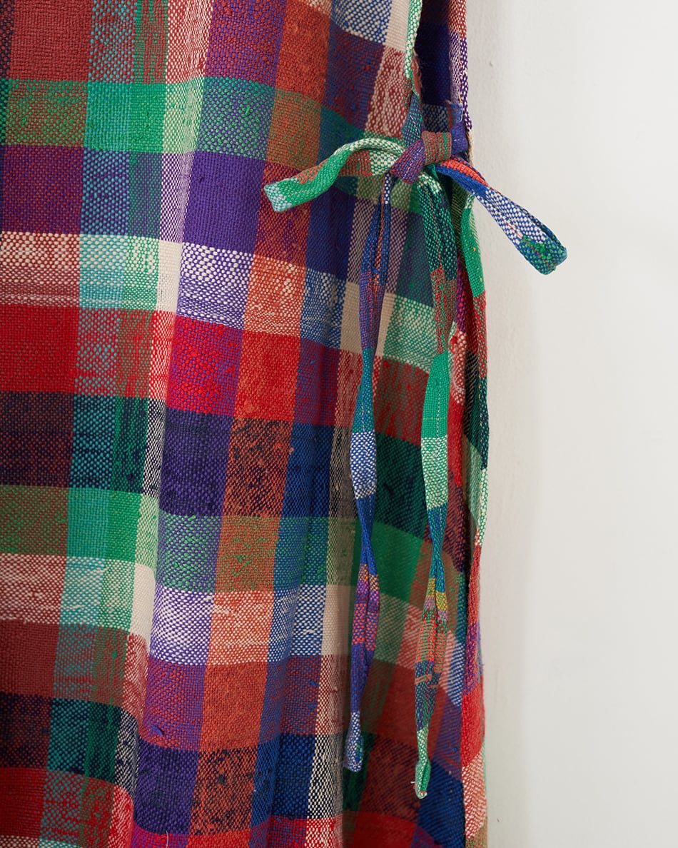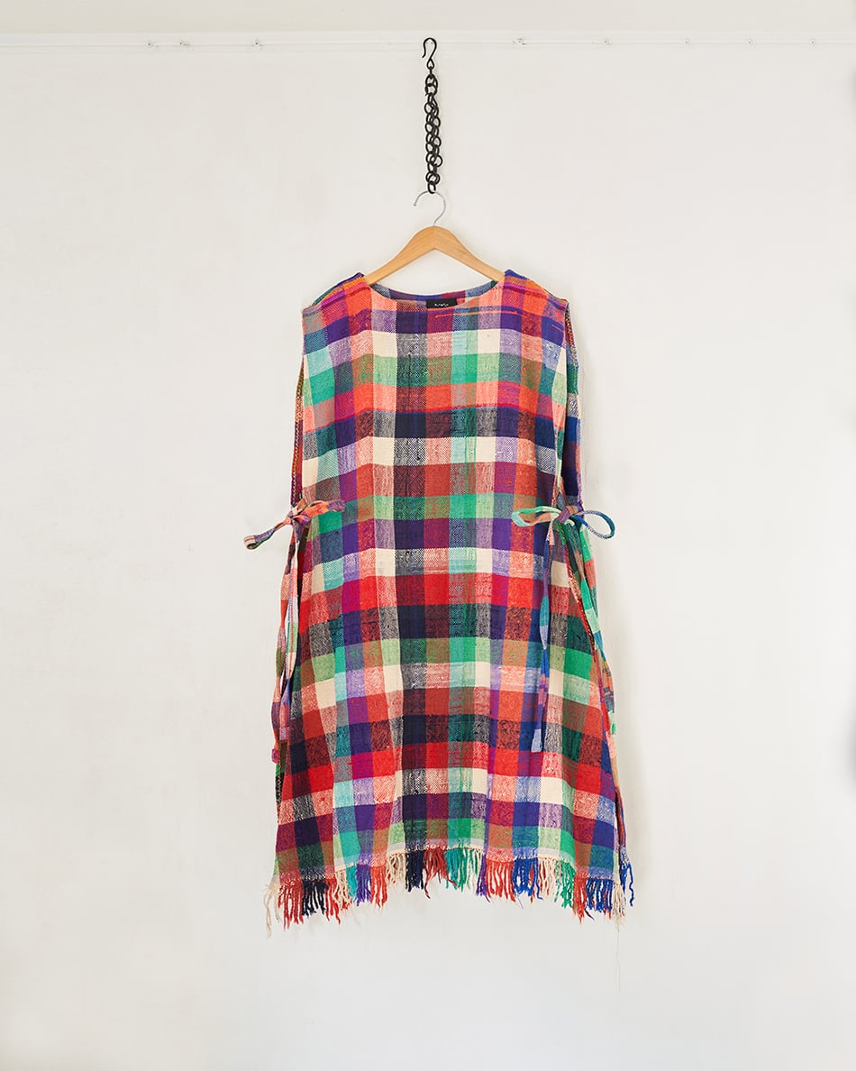 今回は貴重なハイクをほとんど一枚使い、エプロンワンピースを仕立てました。後ろの紐を前で結んだり、前の紐を後ろで結んだり、またサイドで紐を結んだりすることで、ワンピースの表情が変わります。是非この機会にご覧くださいませ。