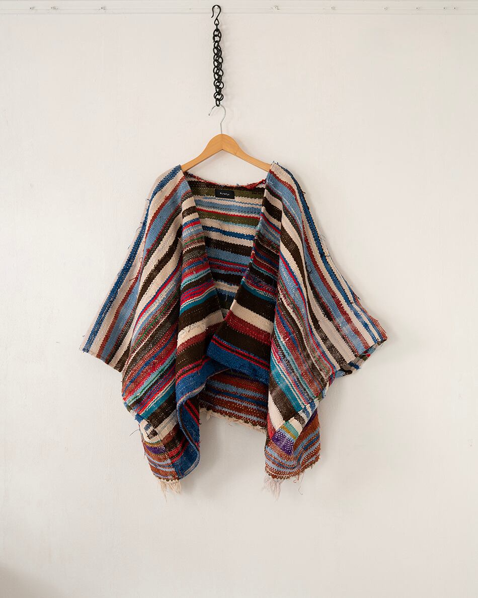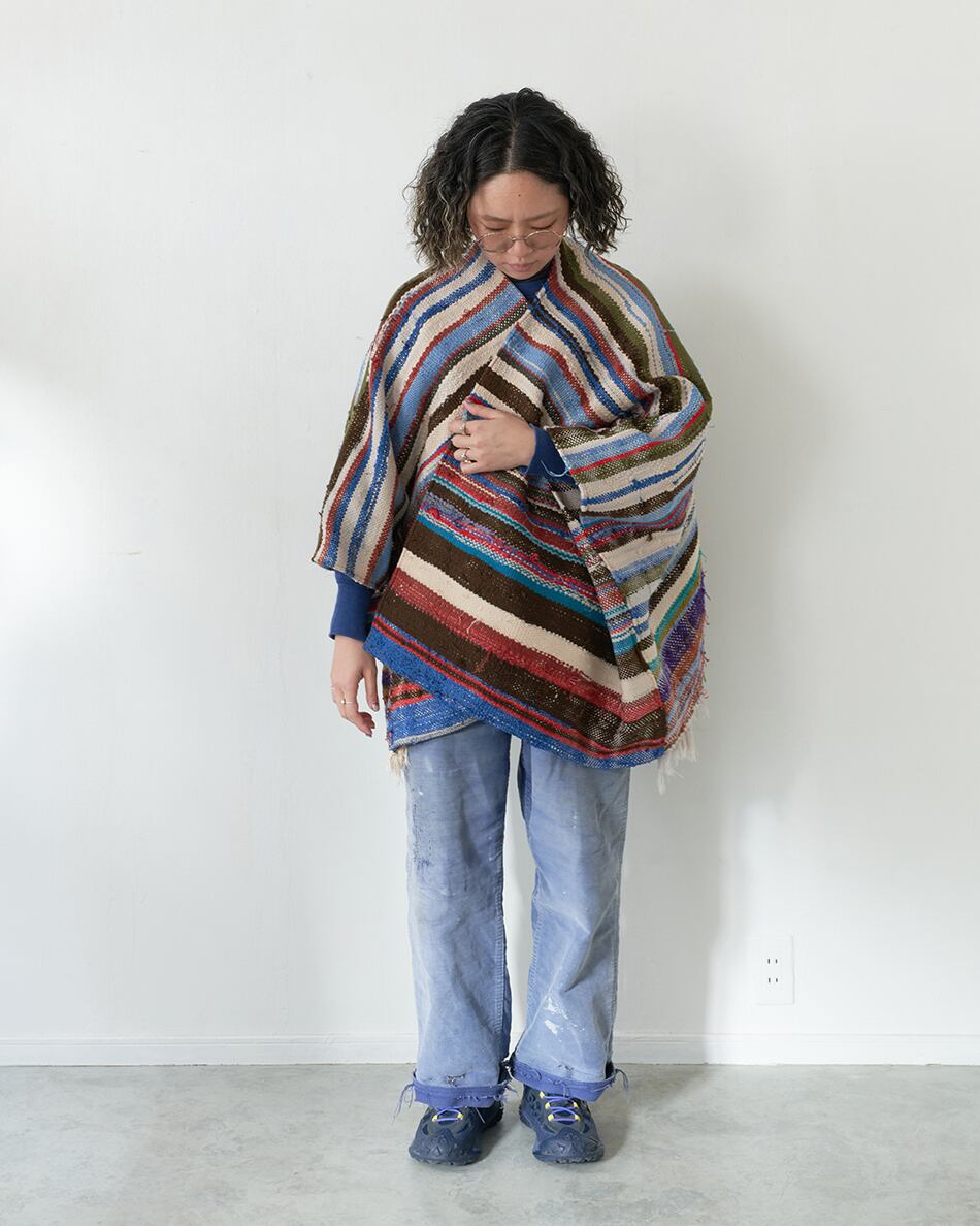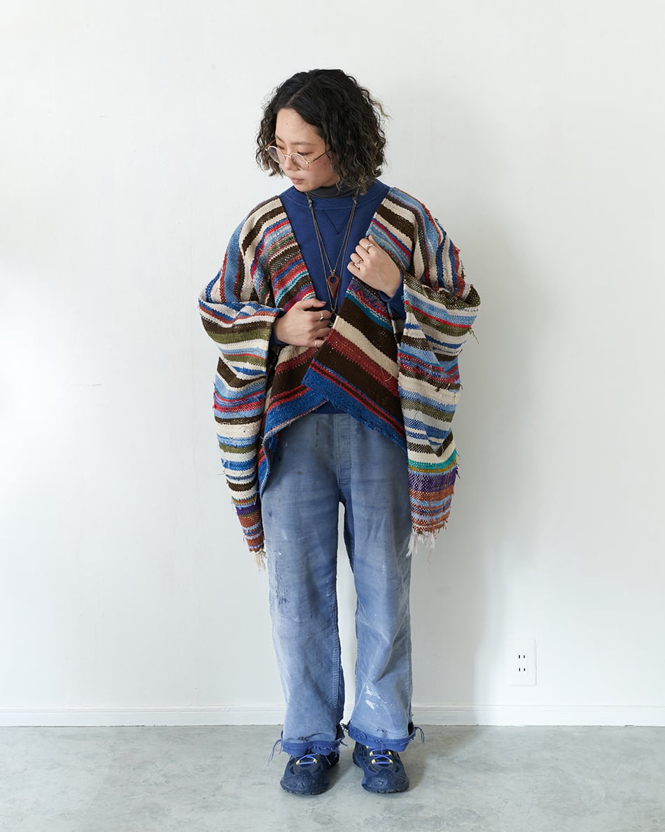 今回は貴重なハイクを使い、ポンチョ型の羽織を作りました。こちらはハイクの中でも、比較的厚みのある生地を使用しているため、冬場はインナーダウンなどを合わせてアウターとしてもお使いいただけます。また、春先には薄手のカットソーの上から羽織っていただくのもおすすめです。この機会にご覧くださいませ。