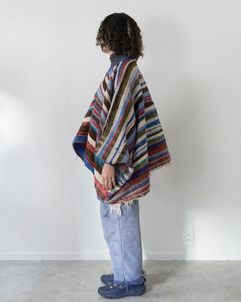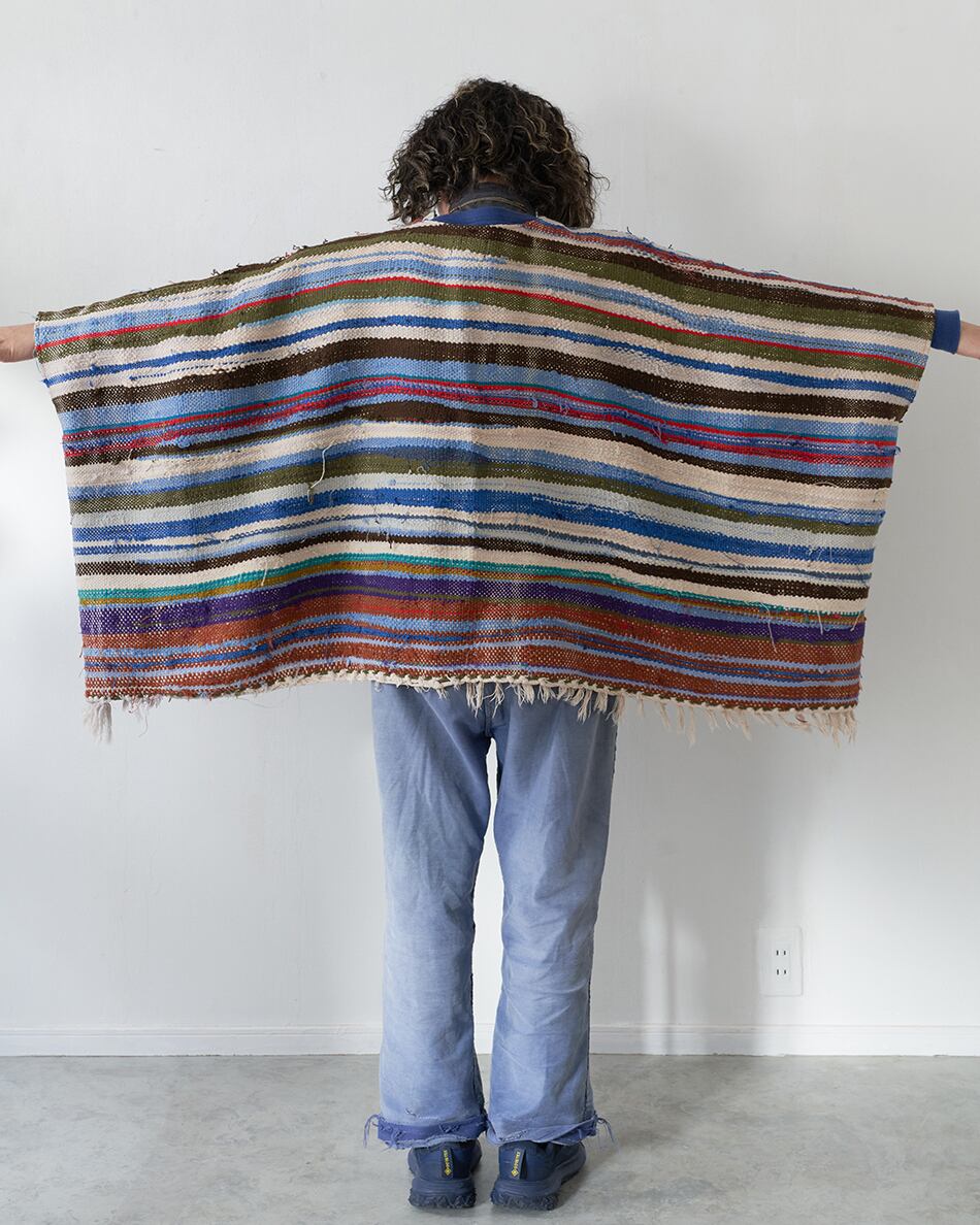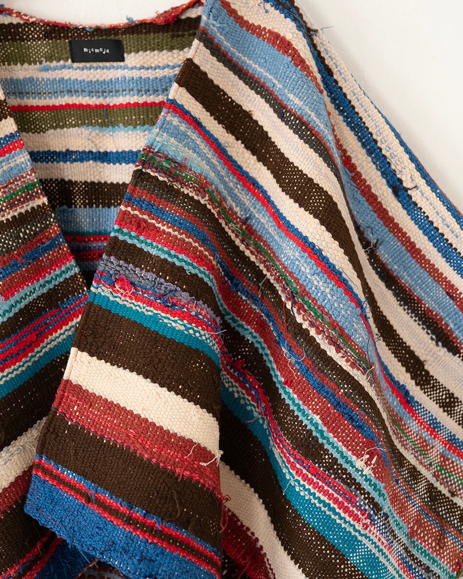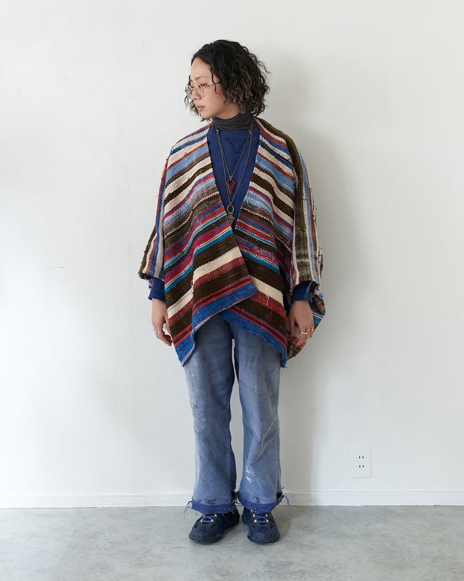 今回は貴重なハイクを使い、ポンチョ型の羽織を作りました。こちらはハイクの中でも、比較的厚みのある生地を使用しているため、冬場はインナーダウンなどを合わせてアウターとしてもお使いいただけます。また、春先には薄手のカットソーの上から羽織っていただくのもおすすめです。この機会にご覧くださいませ。