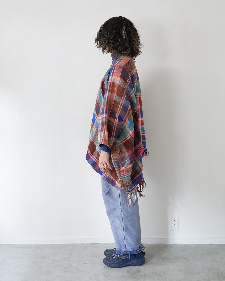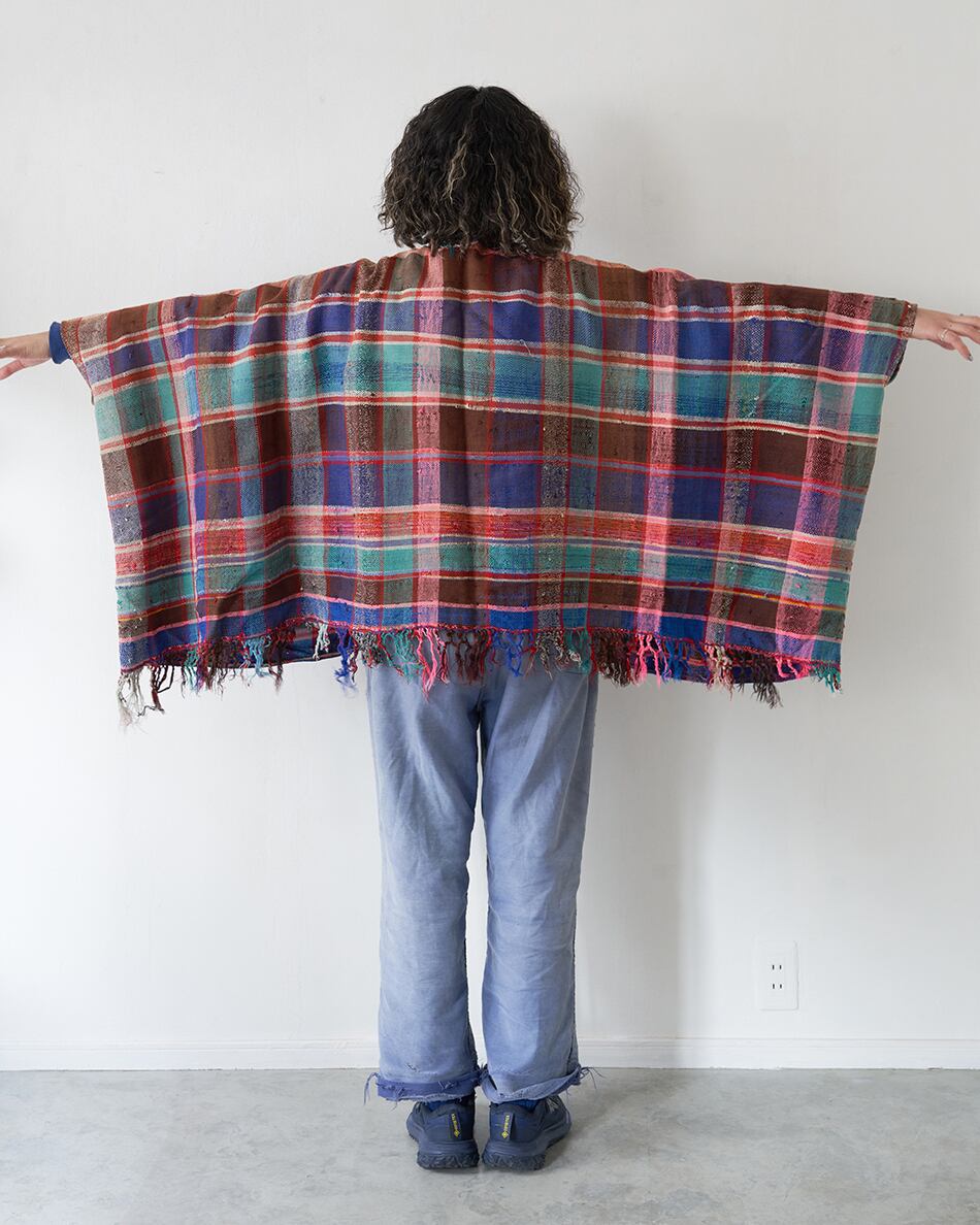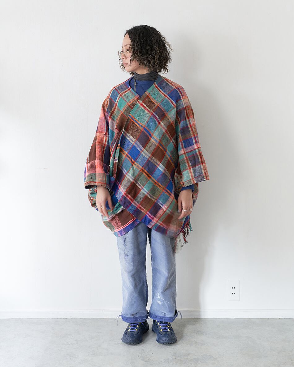 今回は貴重なハイクを使い、ポンチョ型の羽織を作りました。こちらは、薄手のハイクとなっています。シャツやカットソーの上にカーディガンのようにお使いください。この機会にご覧くださいませ。