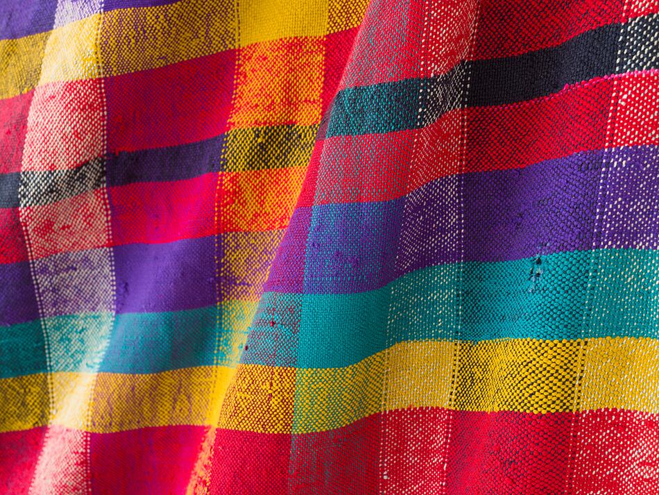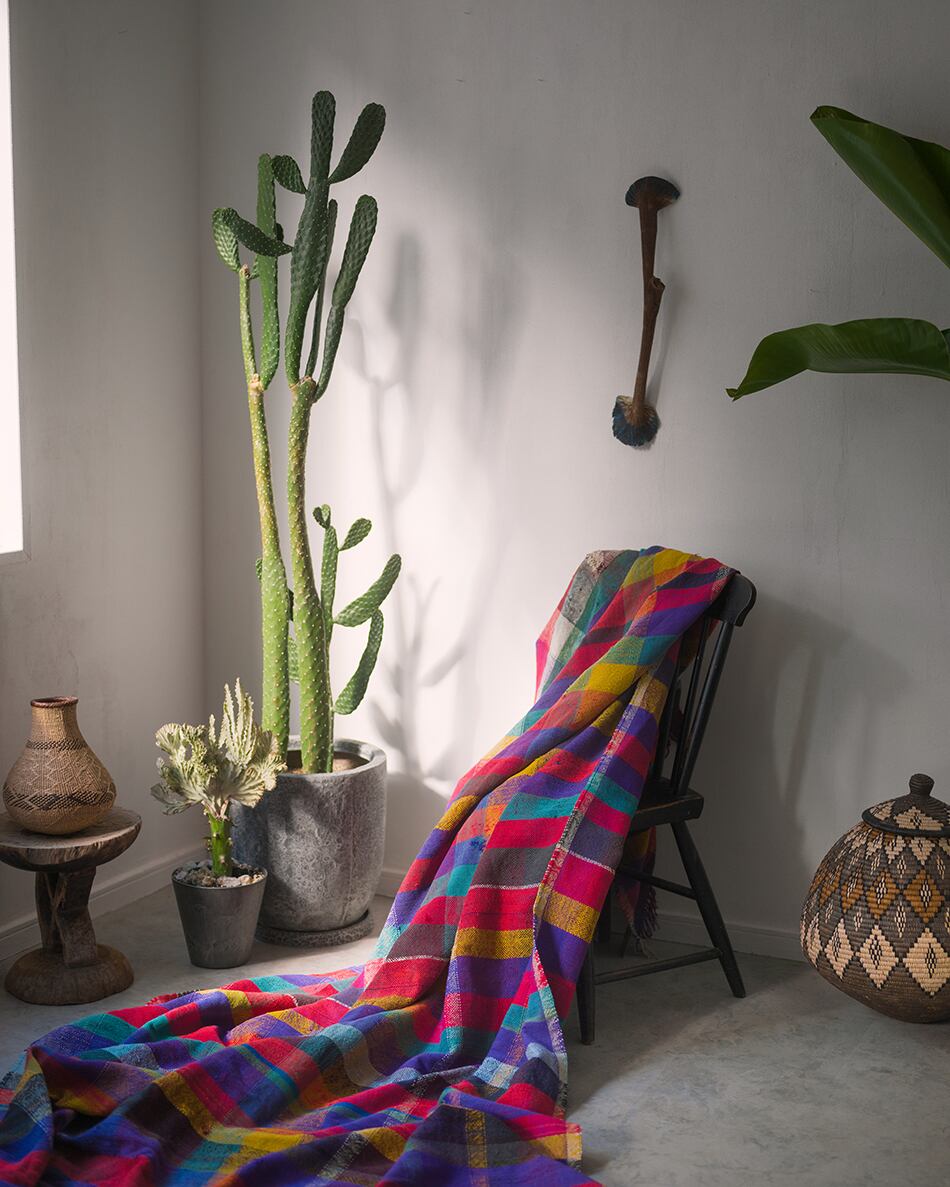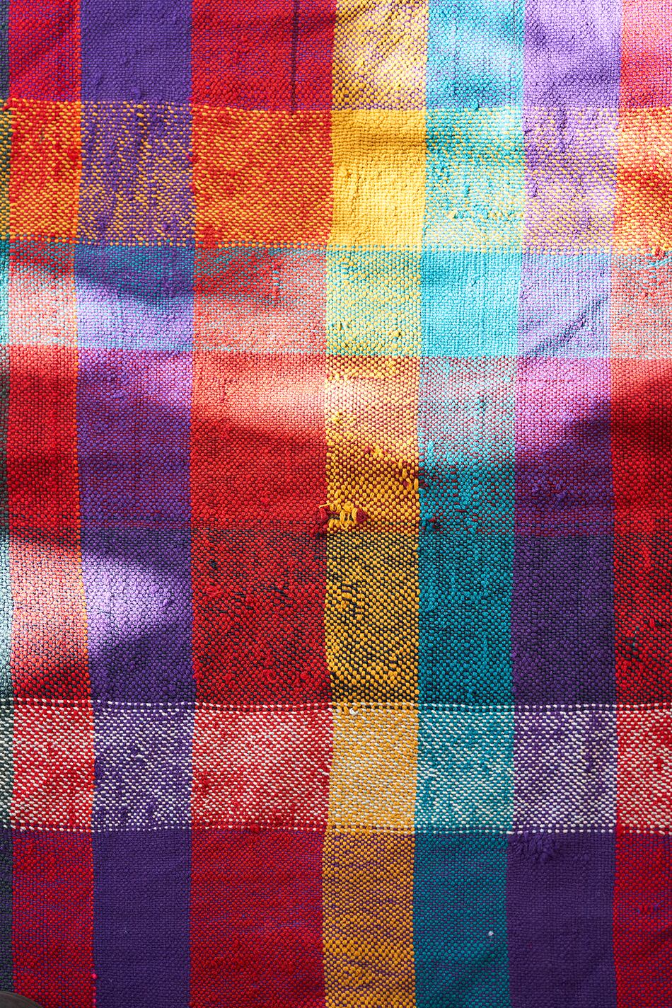 さまざまな色のウールやコットンで織るチェックやストライプはランダムに糸の色を変え、1枚1枚異なり、世界で1枚だけの色合わせとなります。